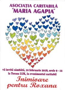 Va invităm, deci, să faceţi mici donaţii pentru ea, sâmbătă, 10 februarie 2018, între orele 9.00 și 12.00, la terasa Luk. Vă vom oferi in schimb cate o inimioară facută de mâinile noastre, ca simbol al dragostei şi mulţumirii noastre.