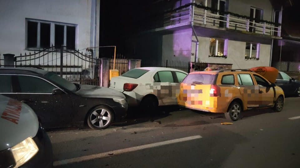 Polițiștii s-au deplasat la fața locului și au constatat că un tânăr de 21 de ani, din Municipiul Aiud, în timp ce conducea un autoturism, pe strada Mărășești, a intrat în coliziune cu două autoturisme staționate regulamentar, producând pagube materiale.