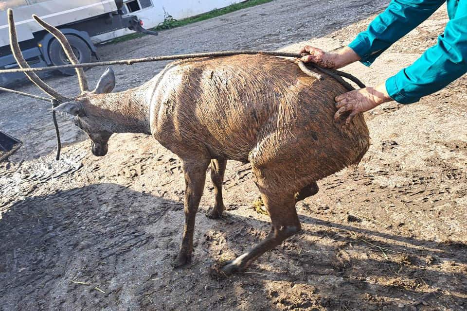 Cerb, căzut în decantorul unei fose septice din comuna Lopadea, salvat în extremis de vânători din Aiud și Ocna Mureș
