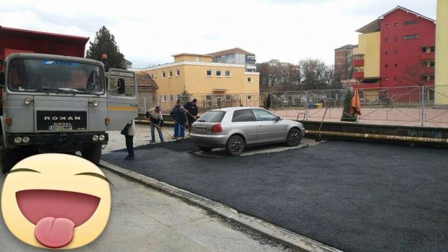 Totul se întâmplă în cartierul „Micro” și pare incredbil. Probabil că proprietarul mașinii în jurul căreia s-a asfaltat nu a fost de găsit, dar firma sau administrația locală nu a putut închiria un utilaj care sa le permită sa ridice mașina?