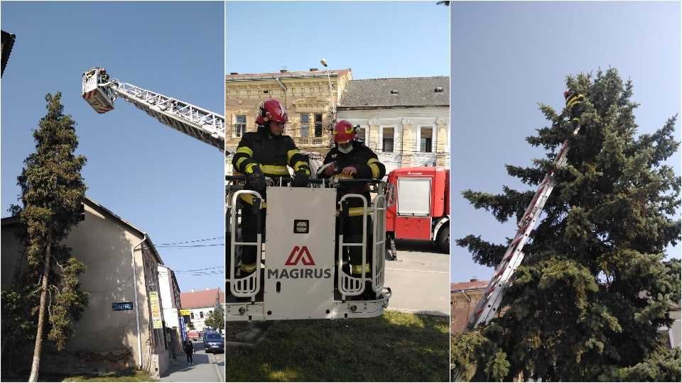 Aceasta a fost salvată în siguranță din copacul respectiv de către pompierii militari, ajunși la fața locului cu o autospecială și o autoscară.