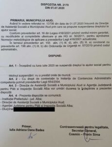 Într-o postare pe o rețea de socializare, primarul municipiului Aiud, Oana Badea, a declarat ca 10 beneficiari vor avea ajutorul social suspendat, pentru că nu și-au prestat orele de muncă