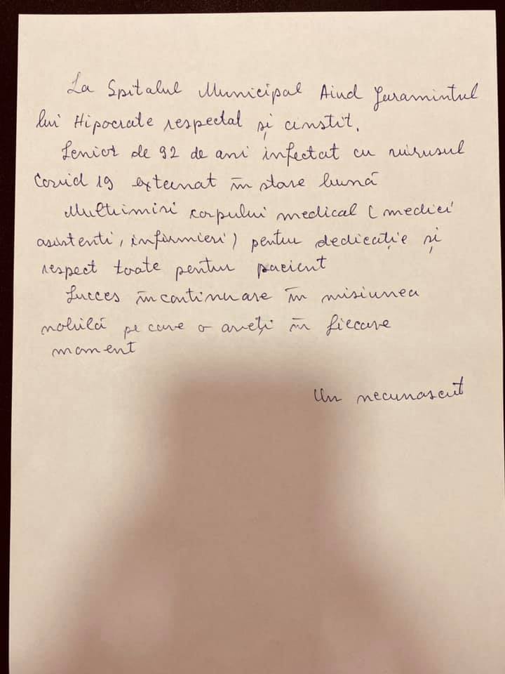 Scrisoarea de mulțumire trimsă de un bărbat cadrelor medicale de la Spitalul Municipal Aiuid, după ce mama sa s-a vindecat de COVID-19