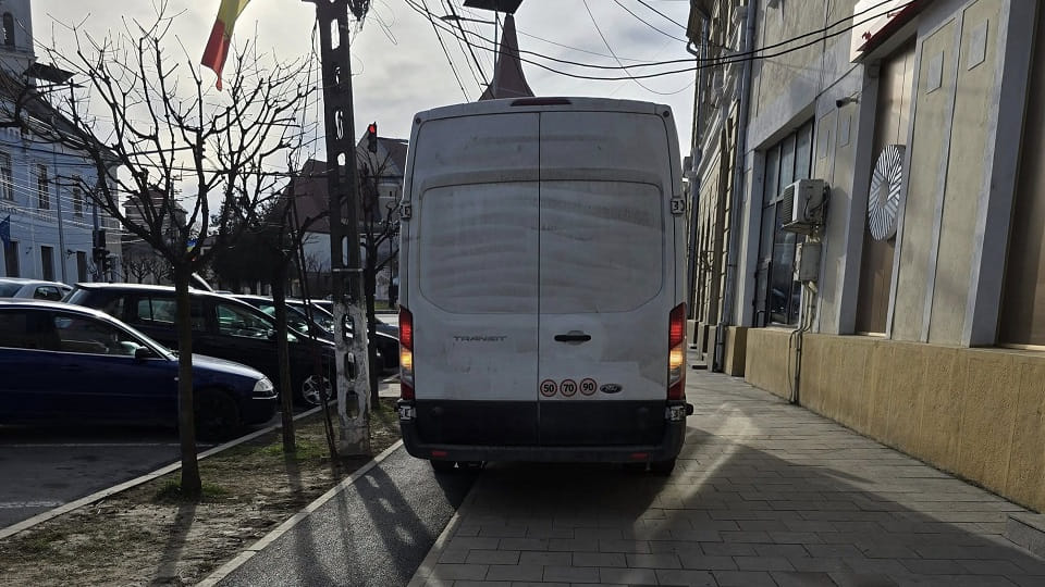 Șoferul unei autoutilitare, amendat de polițiștii locali, după ce a trecut peste spațiul verde și s-a deplasat pe trotuar până în fața Primăriei Aiud