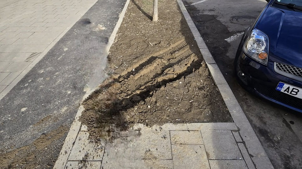 Astăzi, un conducător auto care aproviziona magazinele din zona centrală, a trecut cu mașina prin rondul în care a fost însămânțată iarba. Și-a continuat traseul cu mașina PE TROTUAR până în fața primăriei.