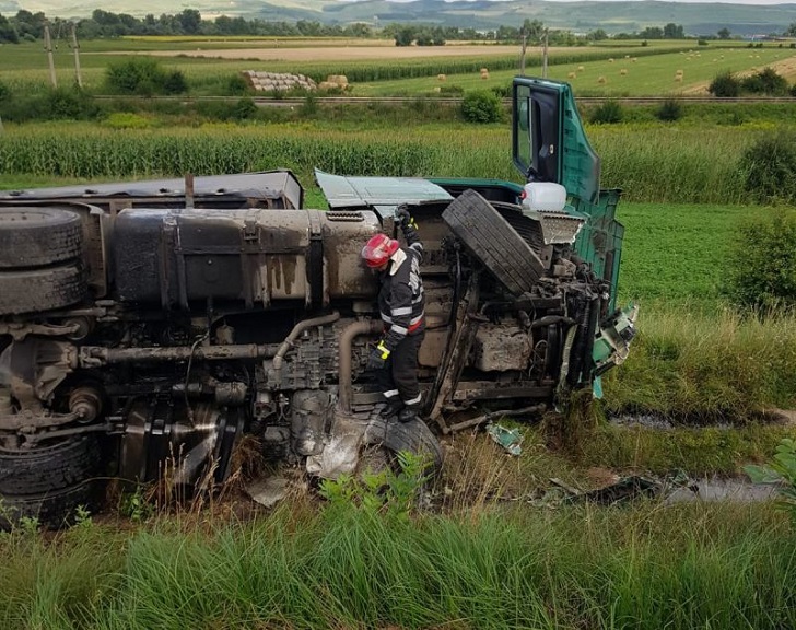 Din primele informații este vorba despre o coliziune între un camion și un autoturism. O persoană este rănită, dar este conștientă.