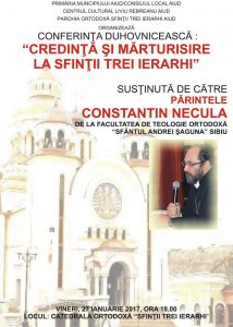 Sfinții Trei Ierarhi Vasile, Grigore și Ioan, patronii spirituali ai municipiului Aiud vor fi sărbătoriți vineri, 27 ianuarie 2017, la Catedrala Ortodoxă din oraș, în cadrul unei conferințe duhovnicești. Intitulată “Credință și Mărturisire la Sfinții Trei Ierarhi”, conferința va fi susținută, cu începere de la ora 18.00, de părintele Constantin Necula de la Facultatea de Teologie Ortodoxă “Sfântul Andrei Saguna” Sibiu.